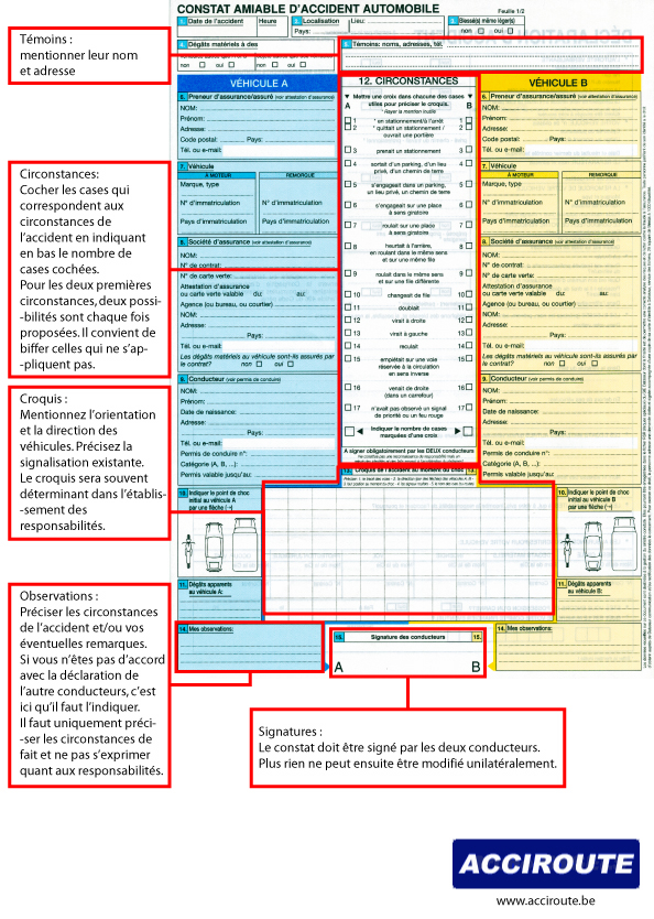 - Le constat amiable d’accident automobile a un caractère européen. Quelle que soit la langue dans laquelle il est établi, les rubriques sont toujours reprises dans le même ordre de sorte que les conducteurs impliqués puissent se comprendre mutuellement.